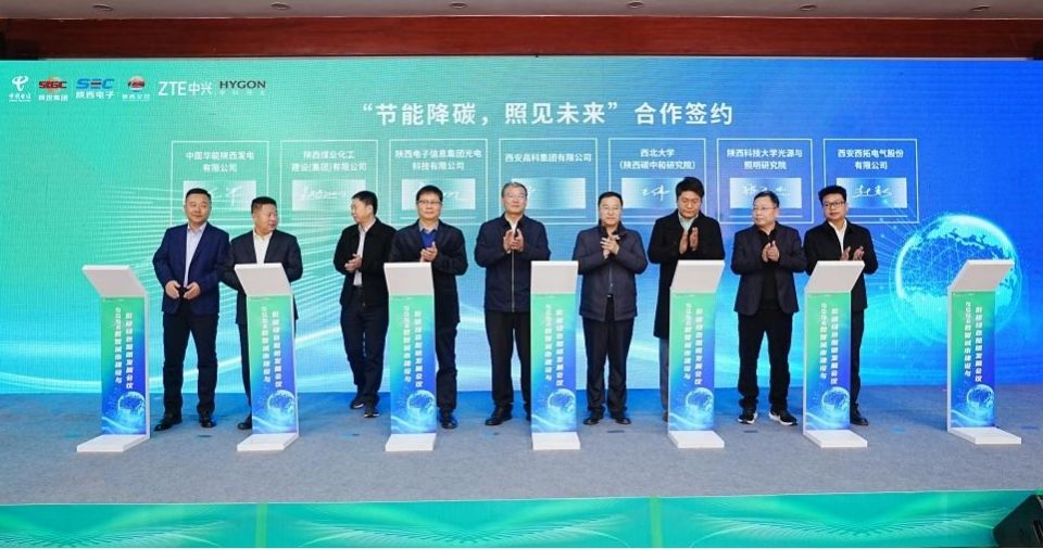 光源與照明研究院代表學(xué)校與中國(guó)電信陜西分公司、陜西電子信息集團(tuán)光電科技有限公司、西北大學(xué)、陜西交控運(yùn)營(yíng)管理有限公司、陜西城市投資運(yùn)營(yíng)集團(tuán)有限公司、中國(guó)華能陜西發(fā)電有限公司等單位,共同發(fā)起“節(jié)能降碳,照見未來(lái)”倡議,并在“數(shù)智化賦能智慧城市建設(shè)”合作協(xié)議上簽約。李志健與陜西省、西安市政府相關(guān)領(lǐng)導(dǎo)共同見證簽約儀式。