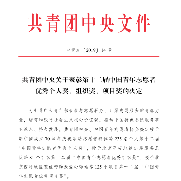 中國青年志愿者優(yōu)秀個人獎、組織獎、項目獎是由共青團(tuán)中央、中國青年志愿者協(xié)會授予的我國青年志愿服務(wù)領(lǐng)域的最高榮譽。該獎項于1996年開始組織實施,每2年評選1次,至今已評選過十二屆,旨在選樹青年志愿服務(wù)優(yōu)秀典型,展示、推介全團(tuán)青年志愿者工作重點品牌項目,推進(jìn)青年志愿服務(wù)文化建設(shè),推動青年志愿服務(wù)形成社會功能,促進(jìn)青年志愿者行動深入、持久和創(chuàng)新開展。