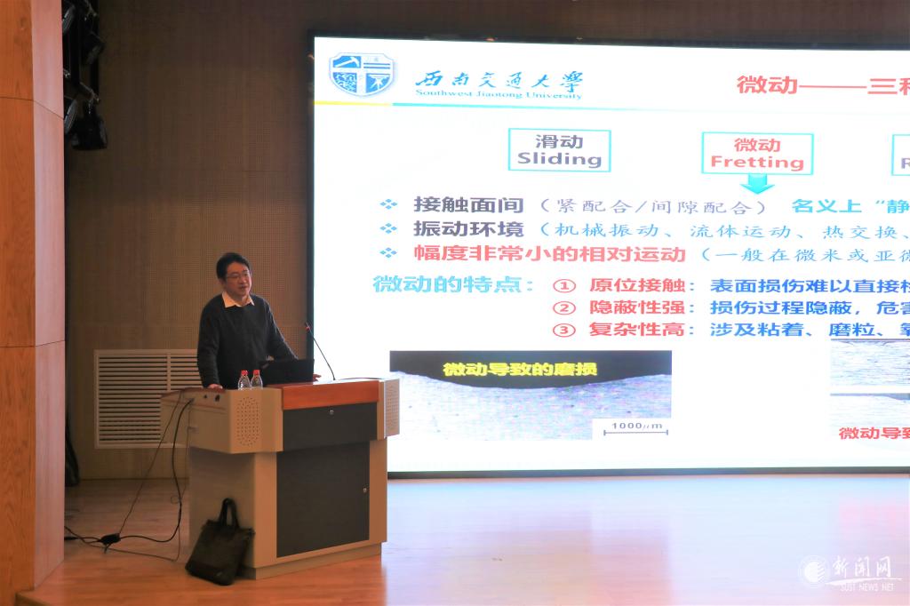 朱旻昊教授以《全模式微動(dòng)磨損試驗(yàn)系統(tǒng)研制》為題,首先介紹了微動(dòng)磨損的特點(diǎn)以及工業(yè)領(lǐng)域中微動(dòng)磨損失效的典型案例,將微動(dòng)摩擦學(xué)理論與實(shí)驗(yàn)相結(jié)合,解決了微動(dòng)磨損中切向、徑向、轉(zhuǎn)動(dòng)以及扭動(dòng)多模式集成、位移精準(zhǔn)控制以及損傷過(guò)程的原位探測(cè)三大難題。隨后朱教授詳細(xì)介紹了微動(dòng)磨損系統(tǒng)的構(gòu)建方案與實(shí)施效果。最后,基于開(kāi)發(fā)的微動(dòng)磨損系統(tǒng),就工業(yè)領(lǐng)域中典型磨損失效案例,開(kāi)展了一系列微動(dòng)磨損實(shí)驗(yàn)。報(bào)告會(huì)后,朱教授與現(xiàn)場(chǎng)師生展開(kāi)了深入討論,并耐心地解答了與會(huì)師生提出的問(wèn)題,使在場(chǎng)師生匪淺。