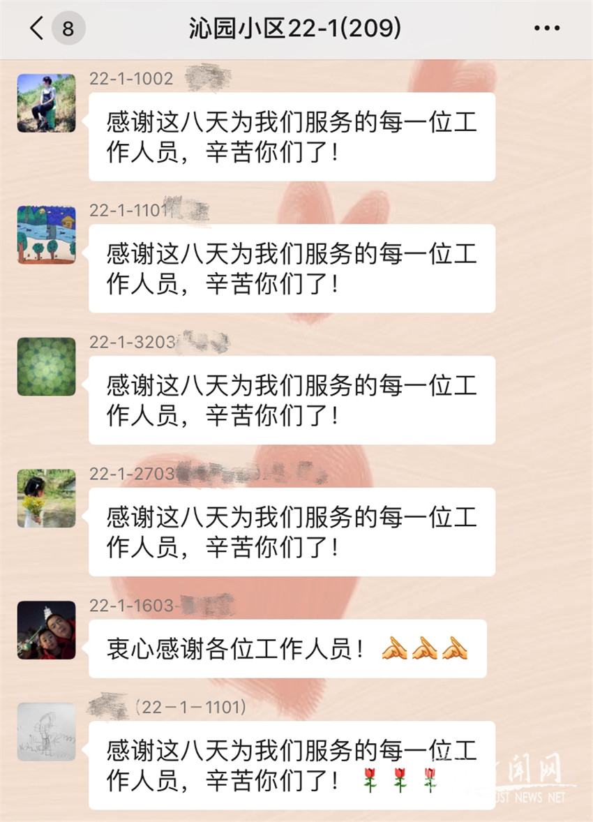 當(dāng)然,解除隔離讓我們終于可以自己取快遞、自己買(mǎi)菜了,終于不用再給那些為我們?nèi)找贡济Φ墓ぷ魅藛T繼續(xù)添麻煩了?!案兄x為我們服務(wù)的每一位工作人員,辛苦你們了!”大家用整齊的感謝話(huà)語(yǔ)刷滿(mǎn)了我們22號(hào)樓1單元的居民微信群。