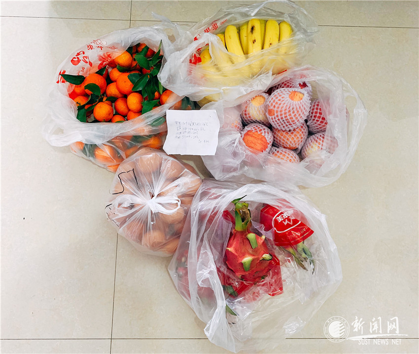 上午11:00 突然傳來(lái)的敲門(mén)聲打破了家里的安靜,老公趕緊跑去開(kāi)門(mén),我坐在沙發(fā)上回頭一看是個(gè)身著防護(hù)服的“蒙面大俠”,雙手提滿(mǎn)了東西。我心想,難道是我們剛和后勤集團(tuán)訂的雞蛋,這送來(lái)的也太快了吧,再說(shuō)5斤雞蛋也不至于裝這么多袋子吧。東西拿進(jìn)家,我仔細(xì)一看,還有蘋(píng)果、香蕉、火龍果和桔子。老公說(shuō),他和負(fù)責(zé)給我們隔離單元供應(yīng)菜品的張海東老師聯(lián)系買(mǎi)雞蛋的時(shí)候,告訴張老師家里有孕婦,看能不能順便再幫忙買(mǎi)點(diǎn)水果。沒(méi)想到一個(gè)人負(fù)責(zé)為整個(gè)隔離單元配送蔬菜的他,給我們帶來(lái)了這么新鮮、豐富的水果。