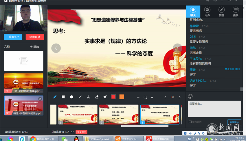 在疫情防控的關(guān)鍵期,學(xué)院高度重視教學(xué)工作的有效推進,想方設(shè)法協(xié)調(diào)解決困難問題,提供可行建議,做好服務(wù)保障,構(gòu)建起“精細有序、精準對接、線下順暢、線上通暢”的工作模式。通過加強在線教學(xué)過程中的班級管理和學(xué)生管理,及時建立師生聯(lián)系交流平臺,利用課前告知、課中講授、課后反饋的運行安排,保證上下貫通和良性互動,確保學(xué)生跟得上、跟得緊、學(xué)得好。3月2日,學(xué)校在線教學(xué)啟動首日,全體思政課教師心系教學(xué),心系學(xué)生,堅持防疫和工作兩不誤,以高度的使命感和責(zé)任感,在教學(xué)崗位上認真授課,師生互動頻繁,思想政治理論課第一天線上授課圓滿完成。