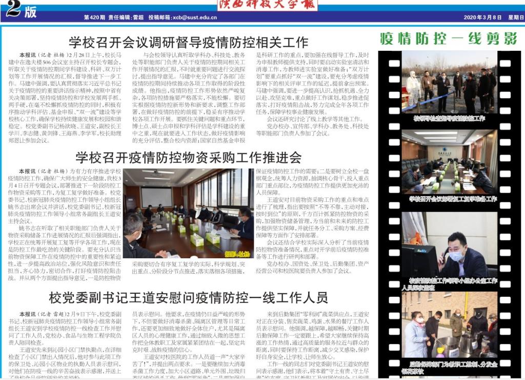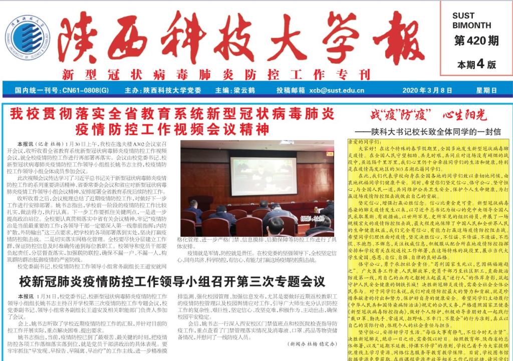 新冠肺炎阻隔了我們的距離,卻阻隔不了我們讀報(bào)的熱情,在這個(gè)春暖花開(kāi)的三月,《陜西科技大學(xué)報(bào)》成為省內(nèi)高校中率先出版疫情防控??男?bào)之一。陜科大全體報(bào)人站在新聞一線,用鏡頭與筆尖呵護(hù)著報(bào)紙的溫度,通過(guò)緊鑼密鼓的采寫(xiě)、拍攝、編輯、打版、校對(duì)、刊印,《陜西科技大學(xué)報(bào)》疫情防控工作??K于呈現(xiàn)在科大師生面前。為了讓廣大校友、校內(nèi)外師生及時(shí)了解我校疫情防控期間的詳細(xì)工作及感人故事,適應(yīng)融媒體時(shí)代閱讀需要,還制作了網(wǎng)頁(yè)版、微信版,讓廣大讀者先睹為快。