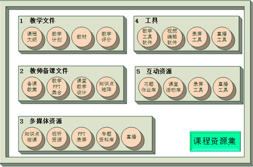 無論選擇什么平臺來建設課程,課程資源的準備都是重點。教師在多年的教學實踐中積累的教學資源,加以組織和提煉,特別是精心設計的視頻微課資源建設,將構成在線開放課程的精華,我將其總結為如下圖的框架結構: