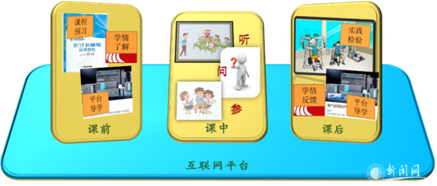 無論是教還是學,在校學生的在線課程教學,都應該是線上與線下的結合,是建立在“互聯網+”之上的、多種教學手段合理運用的混合式教學,如下圖所示: