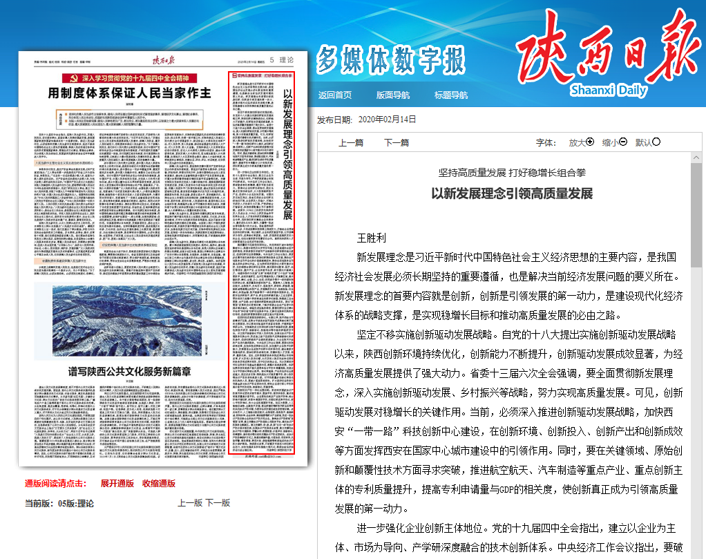 2月14日,《陜西日報》理論版刊發(fā)了我校經(jīng)濟(jì)與管理學(xué)院王勝利教授的署名文章《以新發(fā)展理念引領(lǐng)高質(zhì)量發(fā)展》。