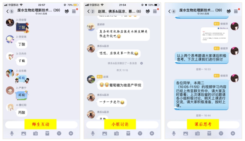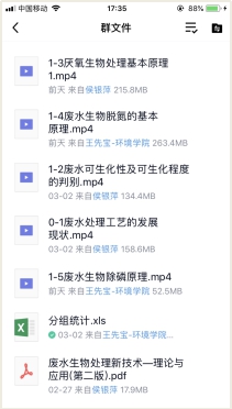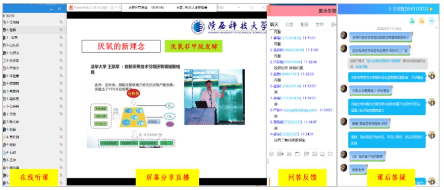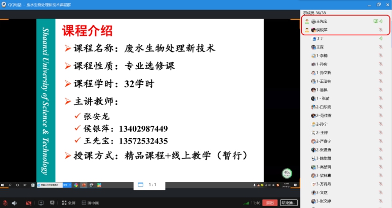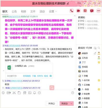 經(jīng)過充分對比測試,由于QQ群具有以下三方面優(yōu)點:①普及度高,學(xué)生100%能熟練使用QQ,操作門檻低;②結(jié)合研究生小班(32人)教學(xué)的特點,通過QQ電話能夠?qū)崿F(xiàn)視頻音頻教學(xué)、屏幕分享演示PPT、課堂討論等教學(xué)手段;③群文件容量充足(10G),滿足相關(guān)教學(xué)資源上傳存儲要求。最終,建立了《廢水生物處理新技術(shù)》課程交流QQ群,使用QQ多人會話的方式開展本門課程的線上教學(xué)。