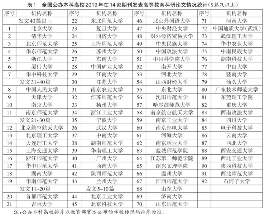 2019年全國高校高等教育科研論文統(tǒng)計的范圍為中文社會科學(xué)引文索引(CSSCI)與《中文核心期刊要目總覽》中復(fù)合影響因子不低于0.9的14家教育類期刊上刊載的高等教育科研論文。這14家期刊具體包括《教育研究》(北京)《中國高教研究》(北京)《高等工程教育研究》(武漢)《清華大學(xué)教育研究》(北京)《高等教育研究》(武漢)《高校教育管理》(鎮(zhèn)江)《北京大學(xué)教育評論》(北京)《復(fù)旦教育論壇》(上海)《江蘇高教》(南京)《中國高等教育》(北京)《高教探索》(廣州)《學(xué)位與研究生教育》(北京)《大學(xué)教育科學(xué)》(長沙)《現(xiàn)代大學(xué)教育》(長沙)等。