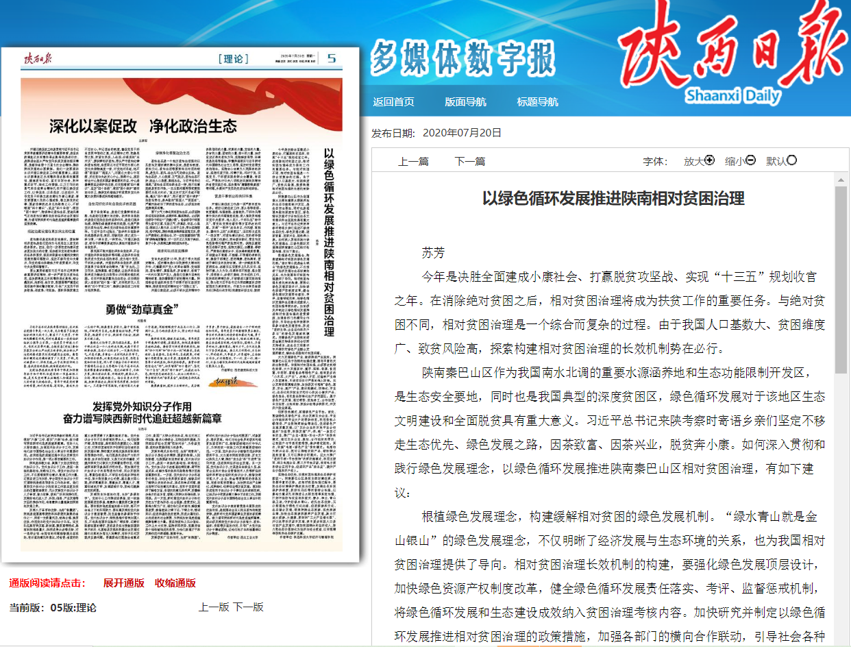 7月20日,《陜西日報》理論版刊發(fā)了我校經(jīng)濟(jì)與管理學(xué)院蘇芳教授的署名文章《以綠色循環(huán)發(fā)展推進(jìn)陜南相對貧困治理》。