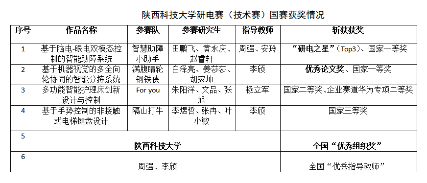 8月21日,“兆易創(chuàng)新杯”第十五屆中國研究生電子設(shè)計(jì)競賽總決賽在南京信息工程大學(xué)圓滿閉幕。經(jīng)過3天激烈角逐,我校參賽的4支技術(shù)賽團(tuán)隊(duì)全部獲獎(jiǎng),斬獲全國一等獎(jiǎng)2項(xiàng),二等獎(jiǎng)1項(xiàng),三等獎(jiǎng)1項(xiàng),并獲優(yōu)秀論文獎(jiǎng)1項(xiàng)、華為企業(yè)賽道專項(xiàng)獎(jiǎng)1項(xiàng),電控學(xué)院周強(qiáng)教授、電智學(xué)院李頎教授獲評“優(yōu)秀指導(dǎo)教師”,我校獲評全國“優(yōu)秀組織獎(jiǎng)”。與此同時(shí),由周強(qiáng)、安玲老師指導(dǎo),研究生趙睿軒、田鵬飛、黃永慶完成的《基于腦電—眼電雙模態(tài)控制的智能助障系統(tǒng)》作品入圍全國TOP10進(jìn)行競演展示,并最終獲得全國第三名,與國防科技大學(xué)(TOP1)、華中科技大學(xué)(TOP2)團(tuán)隊(duì)一起摘獲“研電之星”桂冠!這是我校首次入圍全國十強(qiáng),也是本次賽事中西北賽區(qū)唯一獲得“研電之星”殊榮的單位。