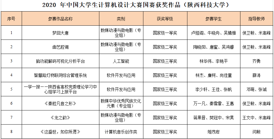 由于本屆大賽受新冠肺炎疫情影響,在教務(wù)處、電智學(xué)院、設(shè)藝學(xué)院的精心組織下,賽前培訓(xùn)采取了遠(yuǎn)程指導(dǎo)、遠(yuǎn)程答辯方式,指導(dǎo)教師和參賽學(xué)生克服困難,在西北賽區(qū)獲得23項(xiàng)獎(jiǎng)勵(lì)的基礎(chǔ)上,利用暑期打磨、優(yōu)化作品,圓滿完成了比賽任務(wù)。