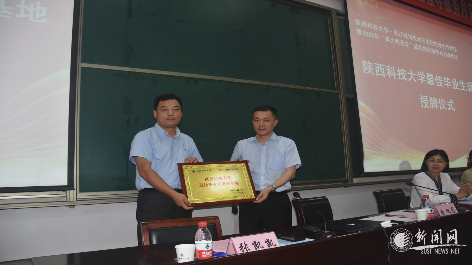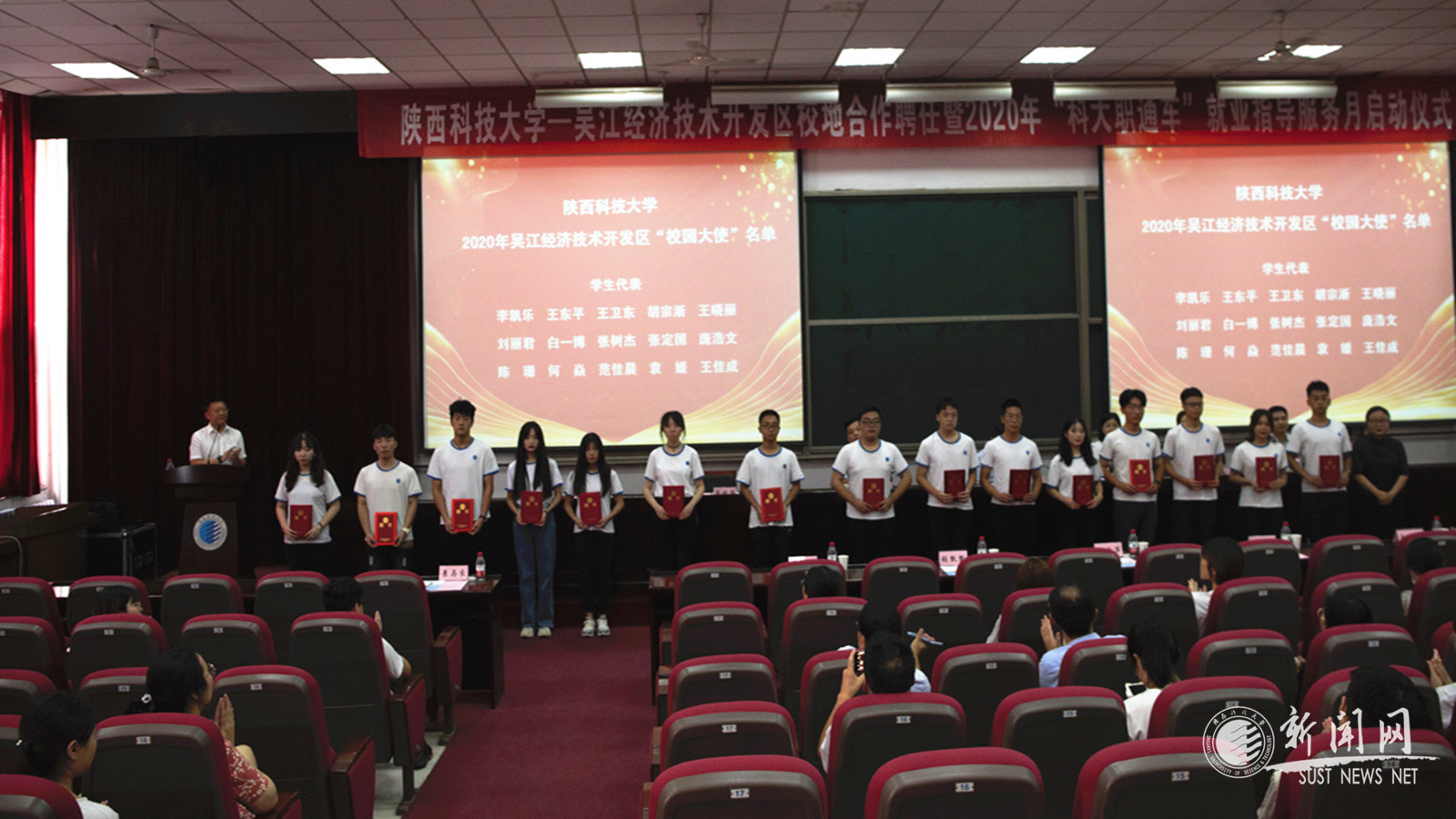 儀式上,張凱凱對吳江經濟技術開發(fā)區(qū)連續(xù)十余年與我校建立良好合作關系,來我校選聘英才表示感謝,并介紹了我校畢業(yè)生就業(yè)工作思路與舉措,回顧總結了雙方合作多年來的成果。隨后,吳江經濟技術開發(fā)區(qū)人事和社會保障局副局長秦春芳宣讀《聘任吳江開發(fā)區(qū)校園大使的決定》,局長吳曉萍為5位教師校園大使和15位學生校園大使頒發(fā)聘書。張凱凱代表學校為吳江經濟技術開發(fā)區(qū)頒發(fā)“陜西科技大學最佳畢業(yè)生就業(yè)基地”獎牌,為查旭東頒發(fā)“陜西科技大學校外就業(yè)指導導師”聘書,并宣布2020年“科大職通車”就業(yè)指導服務月正式啟動。
