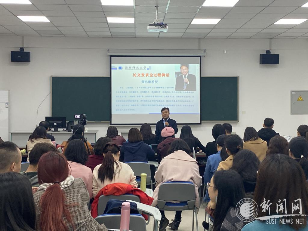 黃忠廉教授本場講座以一篇論文為案例,庖丁解牛,深入全面解析論文發(fā)表全過程。內(nèi)容豐富有據(jù),講解深入淺出,語言生動(dòng)風(fēng)趣,可謂一場學(xué)術(shù)盛宴。黃教授將論文發(fā)表過程凝練為“萌芽與土壤”、“備法備料備私想”、“敢于入手合源流”、“柳暗花明另起灶”、“依綱打造顯核心”、“文不厭改漸深化”以及“有幸轉(zhuǎn)載細(xì)思過 ”七個(gè)方面,七環(huán)緊扣,易懂易記。整場講座,黃教授奇思妙語頻出,以富有生活氣息的智言慧語,啟發(fā)與會(huì)師生思考學(xué)習(xí),使其在輕松愉悅中領(lǐng)悟論文發(fā)表的奧妙所在。其間更將“四個(gè)第一”(第一段、第一行、第一句和第一個(gè)字)、“點(diǎn)+面+外來思想的融合”等多條論文撰寫的寶貴經(jīng)驗(yàn)傾囊相授。黃教授的講座為師生們進(jìn)行論文寫作和發(fā)表提供了指引,拓寬了外語師生們的科研思路。