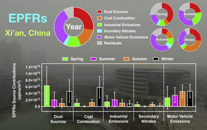 “Source apportionment of environmentally persistent free radicals (EPFRs) in PM2.5over Xi'an, China (西安市PM2.5中環(huán)境持久性自由基EPFR的來(lái)源分配)”基于化學(xué)分析和正定矩陣因子分析(PMF)報(bào)道了PM2.5中EPFR的來(lái)源。本團(tuán)隊(duì)于2017年4月至12月在西安市收集每日PM2.5樣本,并對(duì)EPFR和其他化學(xué)成分進(jìn)行定量分析。揭示了EPFR的五個(gè)主要來(lái)源:揚(yáng)塵源、燃煤源、二次硝酸鹽、工業(yè)排放源和機(jī)動(dòng)車(chē)排放源。燃煤源、機(jī)動(dòng)車(chē)排放源和揚(yáng)塵源是EPFR的三大貢獻(xiàn)者(占76%)。燃煤對(duì)PM2.5和EPFR至關(guān)重要。春季,由于沙塵暴氣象事件的發(fā)生,揚(yáng)塵源對(duì)EPFR的貢獻(xiàn)很大。將PMF結(jié)果與氣象數(shù)據(jù)相結(jié)合后發(fā)現(xiàn),西安市中心排放的大氣污染物可以通過(guò)南風(fēng)運(yùn)到采樣地點(diǎn)。這些結(jié)果表明需要對(duì)EPFRs的公共健康影響進(jìn)行進(jìn)一步研究,并可用于幫助制定污染物源頭控制措施,以減少EPFRs在PM2.5中帶來(lái)的潛在健康風(fēng)險(xiǎn)。全文鏈接:https://doi.org/10.1016/j.scitotenv.2019.06.424