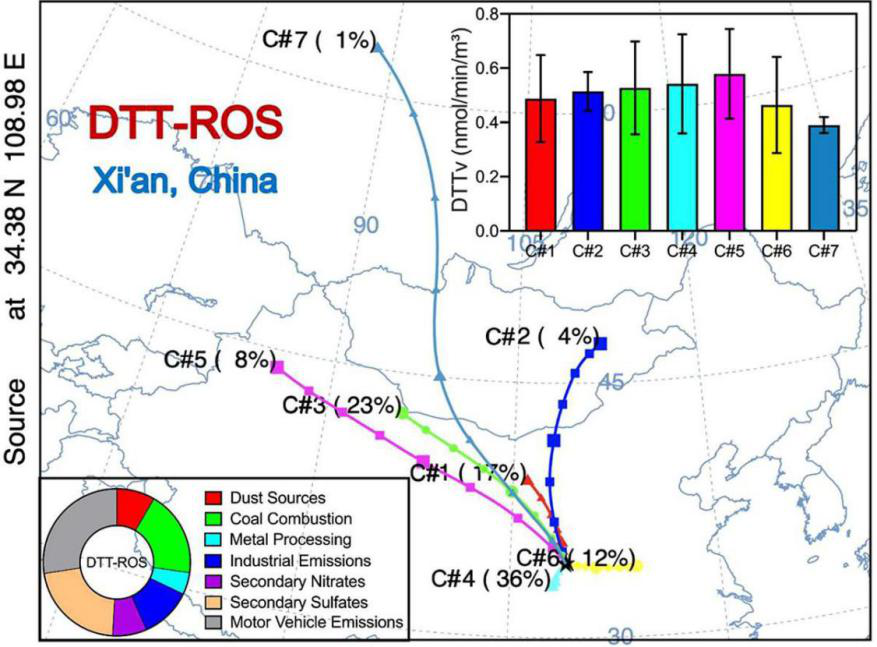 “Study on the oxidation potential of the water-soluble components of ambient PM2.5over Xi'an, China: Pollution levels, source apportionment and transport pathways (西安市環(huán)境PM2.5水溶性組分的氧化潛能研究:污染水平,污染源分配和運(yùn)輸途徑)”以被認(rèn)為是對(duì)人體造成不利影響的大氣顆粒物中的活性氧(ROS)為背景,采用DTT方法測(cè)量了2017年在西安市采集的116個(gè)日細(xì)顆粒物樣品中的ROS水平,并對(duì)大氣顆粒物中ROS的來(lái)源進(jìn)行定量分析。結(jié)果表明,西安市ROS產(chǎn)生水平最高水平發(fā)生在冬季,其次是春季,夏季和秋季。PMF的源解析結(jié)果顯示,PM2.5中ROS主要貢獻(xiàn)源來(lái)自機(jī)動(dòng)車(chē)排放物、二次硫酸鹽和燃煤源。后向軌跡聚類(lèi)分析表明,主要的聚類(lèi)群是本地和區(qū)域運(yùn)輸,而西安上空PM2.5的氧化潛能受遠(yuǎn)程運(yùn)輸?shù)挠绊懘笥谑鼙镜剡\(yùn)輸?shù)挠绊?。如上所述,提高大氣氧化潛力不僅需要區(qū)域性努力,還需要大規(guī)模的聯(lián)合合作。此外,這項(xiàng)關(guān)于大氣顆粒物的氧化潛能的研究以及具體的來(lái)源信息為健康效應(yīng)研究提供了重要的指導(dǎo)。全文鏈接:https://doi.org/10.1016/j.envint.2020.105515