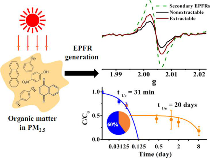 “Environmentally persistent free radical (EPFR) formation by visible-light illumination of the organic matter in atmospheric particles (通過(guò)可見(jiàn)光照射大氣顆粒中的有機(jī)物形成環(huán)境持久性自由基)”證明了二次形成過(guò)程可能是大氣顆粒物中EPFR的重要來(lái)源,然而其形成機(jī)理還有待闡明。本研究表明,二次EPFR可以通過(guò)可見(jiàn)光照射產(chǎn)生。這類(lèi)EPFR的壽命只有30分鐘到1天,比大氣顆粒物中原始EPFR的壽命短得多。研究還發(fā)現(xiàn),可萃取的有機(jī)物促成了二次EPFR的形成(約55%),類(lèi)腐殖質(zhì)物質(zhì)是二次EPFR的主要前體物?;钚匝醪东@實(shí)驗(yàn)表明,原始的EPFR可能有助于單線(xiàn)態(tài)氧的產(chǎn)生,而通過(guò)光激發(fā)產(chǎn)生的二次EPFR可能不會(huì)產(chǎn)生單線(xiàn)態(tài)氧或羥基。全文鏈接:https://doi.org/10.1021/acs.est.9b02327