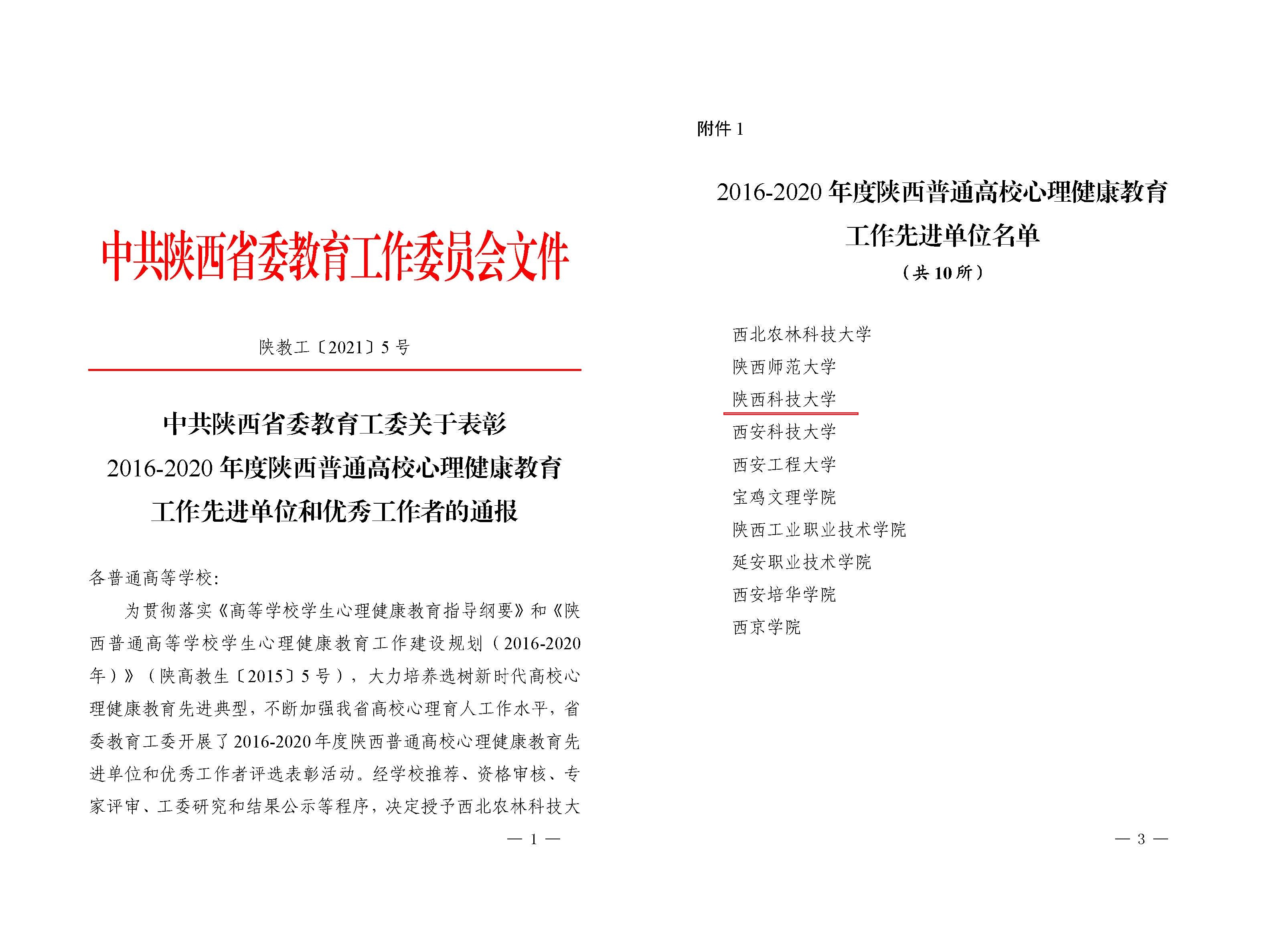 日前,陜西省委教育工委發(fā)文,對2016-2020年度陜西普通高校心理健康教育先進(jìn)單位和優(yōu)秀工作者進(jìn)行通報(bào)表彰。我校等10所高校被授予“2016-2020年度陜西普通高校心理健康教育工作先進(jìn)單位”榮譽(yù)稱號,王慧芳等60位教師被評為“2016-2020年度陜西普通高校心理健康教育優(yōu)秀工作者”。