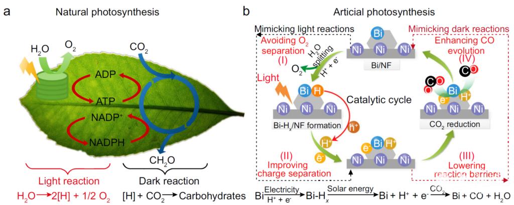在趙進(jìn)才院士工作室的支持下,我校李英宣教授在光催化還原CO2研究領(lǐng)域連續(xù)取得重要進(jìn)展。繼實(shí)現(xiàn)金屬Bi制備和相變機(jī)制研究后(Nature Communications 2017, 8, 14462),利用金屬Bi等離子體光催化劑實(shí)現(xiàn)了自然界植物光合作用中水氧化和CO2還原復(fù)雜反應(yīng)過程全模擬,相關(guān)成果再一次發(fā)表在Nature子刊《自然-通訊》(Nature Communications)上,該成果我校為第一單位,李英宣教授為第一作者,李英宣教授和中科院長春應(yīng)化所王穎副研究員為共同通訊作者,2018級碩士研究生惠丹屏為第二作者。這是李英宣教授在Angew. Chem. Int. Ed.、Environ. Sci. & Technol.等自然指數(shù)期刊發(fā)表論文之后,在光催化還原CO2研究方面取得的又一重要成果。