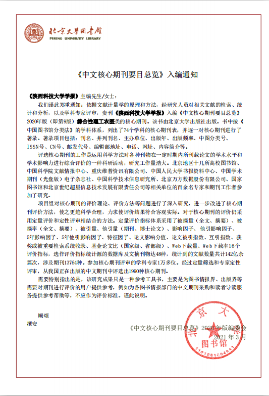 2021年3月8日,接北京大學(xué)《中文核心期刊要目總覽》2020年版編委會正式通知:《陜西科技大學(xué)學(xué)報(bào)》入選《中文核心期刊要目總覽》2020年版(即第9版)綜合性理工農(nóng)醫(yī)類核心期刊。這是繼1992年短暫入編《中文核心期刊要目總覽》(第1版:1992-1996年)后,《陜西科技大學(xué)學(xué)報(bào)》歷經(jīng)24年來的第二次入選。