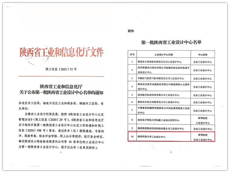 近日,我?!瓣兾骺萍即髮W(xué)工業(yè)設(shè)計(jì)中心”獲得陜西省工業(yè)和信息化廳第一批省級工業(yè)設(shè)計(jì)中心認(rèn)定。