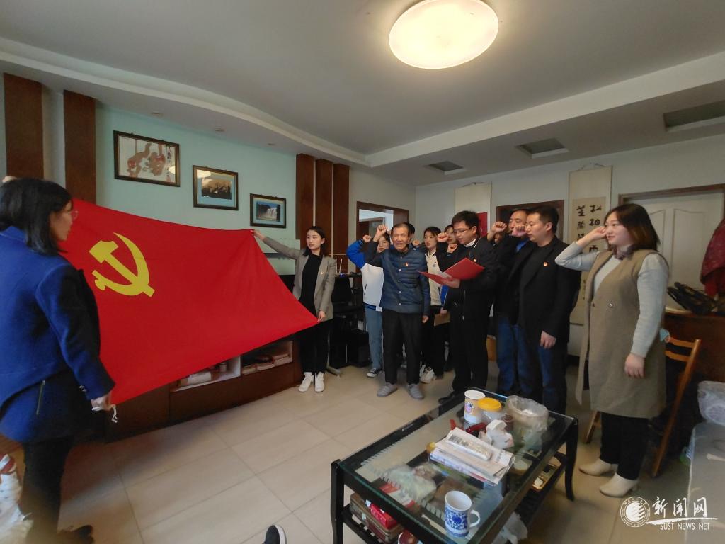 最震撼人心的一幕,當(dāng)黨旗展開(kāi)的瞬間,正在輪椅上跟青年黨員親切交流的鞠文山立刻抬起頭挺直腰板,顫顫巍巍的舉起右手,向黨旗敬軍禮并高呼“共產(chǎn)黨萬(wàn)歲”,堅(jiān)定的眼神閃耀著光芒,手許久都不肯放下,如山一般的姿勢(shì),這就是烙在心里永不磨滅的紅色信仰的力量。這種深入骨髓、融入血液的對(duì)共產(chǎn)主義的信仰、對(duì)黨的忠誠(chéng),深深地震撼了在場(chǎng)所有人的心靈,高舉的黨旗、行軍禮的鞠文山、淚光閃閃的青年黨員、瞬間安靜的現(xiàn)場(chǎng),孱弱的身軀、堅(jiān)定的信仰形成的巨大反差,這一幕給人帶來(lái)的感動(dòng)用任何文字來(lái)形容都是蒼白的,以至于大家都停下了動(dòng)作,忘記了自己要做什么,時(shí)間瞬間定格,一位想找老人合影的學(xué)生滿(mǎn)含淚水從背后拍下珍貴的照片。