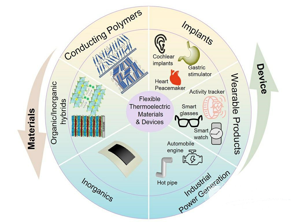 能量在使用過程中大多以廢熱形式排出浪費,熱電材料可將熱能直接轉換為電能從而提高能量利用率。如今隨著多功能、微型電子技術和產(chǎn)品的不斷發(fā)展,探索大功率的微瓦—毫瓦自充電技術顯得尤為重要。柔性熱電材料和器件可以利用較小的溫差進行發(fā)電,而且除了工業(yè)廢熱,自然界中的光熱和人體熱能等均可作為其可持續(xù)的綠色能量來源,因此在為可穿戴和可植入電子產(chǎn)品提供持續(xù)的電源動力方面展現(xiàn)出巨大的應用潛力。該綜述總結了近年來柔性熱電材料的研究進展和器件的設計思路,主要涵蓋了五大類柔性熱電材料,包括導電高分子熱電材料、有機/無機熱電材料、全無機熱電材料、纖維基熱電材料和綠色生物質(zhì)基熱電材料。作者針對每一大類柔性熱電材料,介紹了其基本原理和提高熱電性能的策略,同時精心選取了近年來的典型示例并加以詳細說明。此外,該綜述還總結了目前柔性熱電器件的先進設計策略,包括采用涂覆/基底/支架材料、柔性連接線/電極材料和優(yōu)化不同材料間的界面接觸。最后,該綜述對柔性熱電材料和器件的發(fā)展提出了目前存在的挑戰(zhàn)問題和對未來的前景展望。