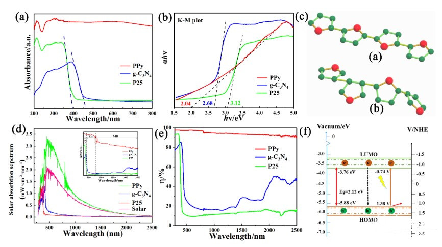 在高性能光催化材料的制備和應(yīng)用方面取得重要進(jìn)展,設(shè)計了一種具有α-α高共軛結(jié)構(gòu)的有機(jī)共軛聚合物PPy光催化材料。相比傳統(tǒng)半導(dǎo)體催化劑P25和氮化碳(g-C3N4)表現(xiàn)出更強(qiáng)的光電、光吸收特性和更優(yōu)異的光催化性能。成果發(fā)表在國際知名期刊Applied Catalysis B:Environmental上,該研究工作我校李永博士為第一作者,我校賈曉華教授、宋浩杰和南京林業(yè)大學(xué)楊小飛教授為共同通訊作者。