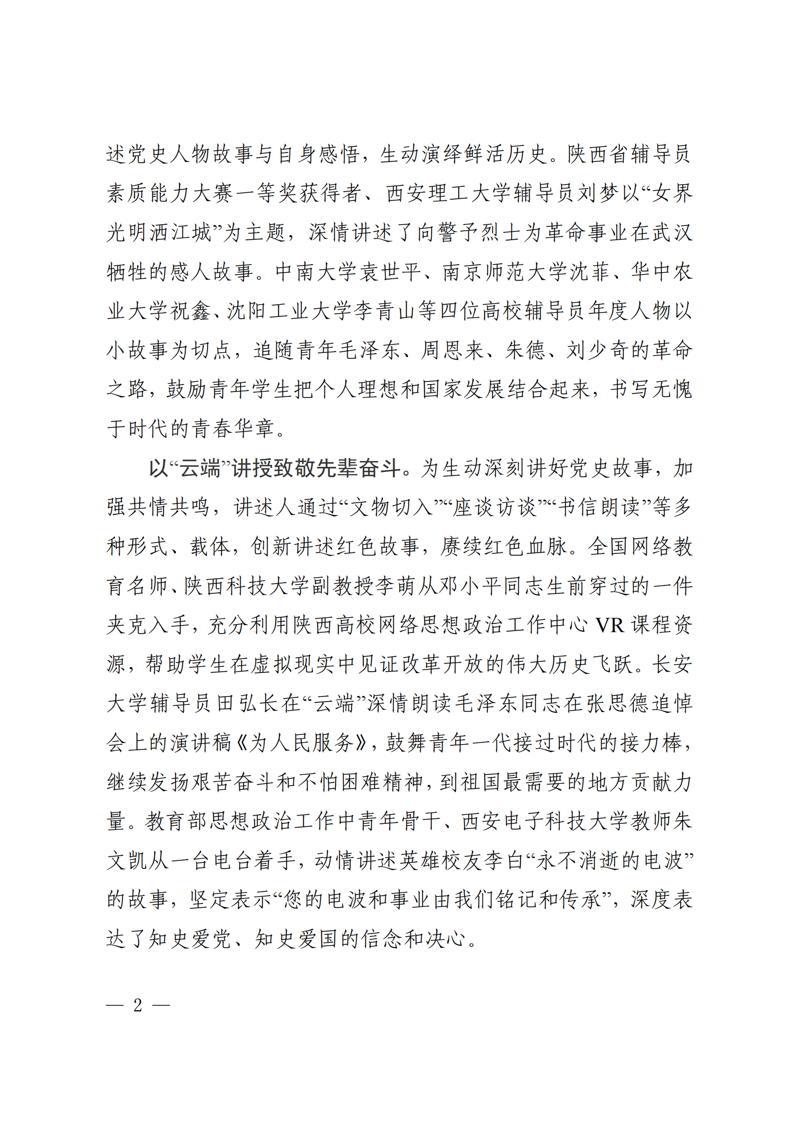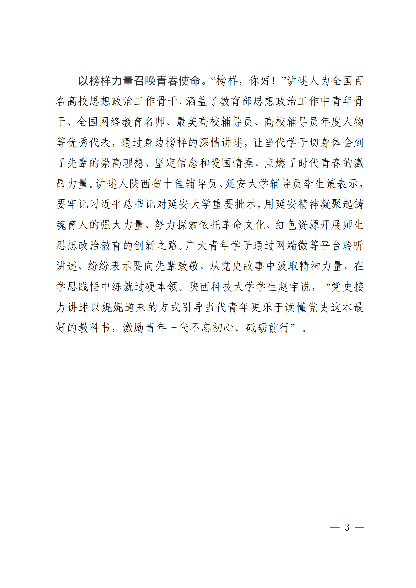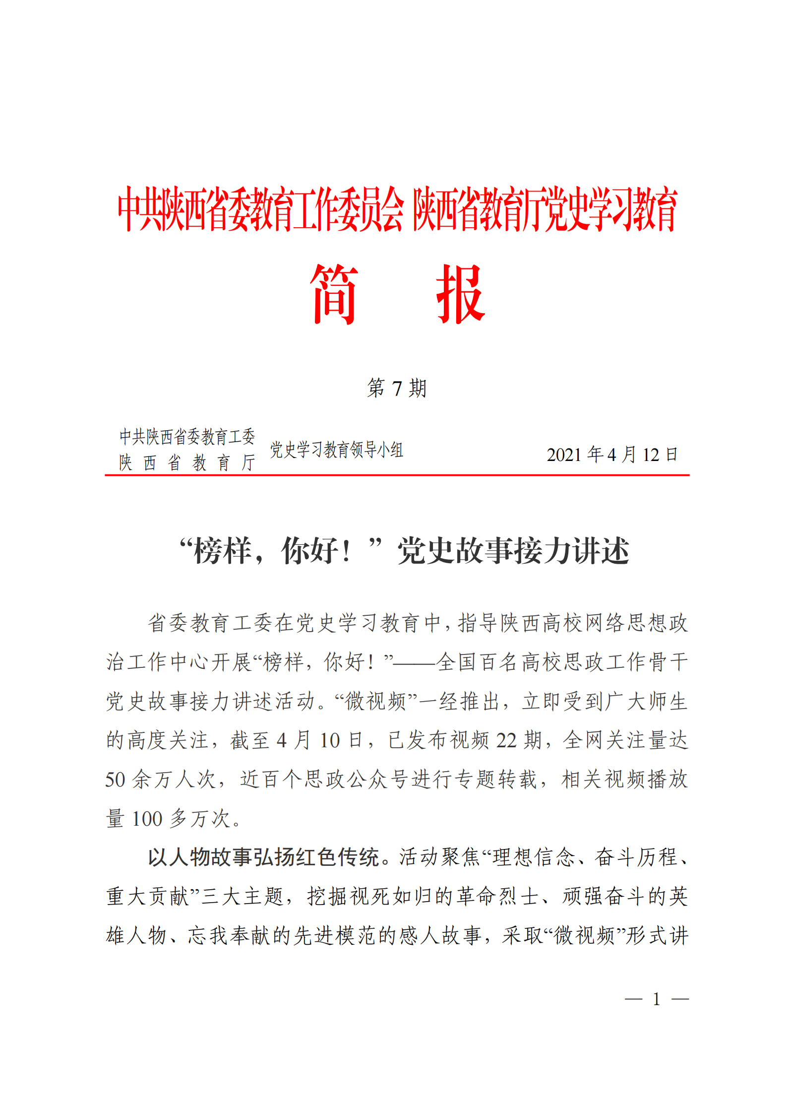 4月12日,《中共陜西省委教育工作委員會、陜西省教育廳黨史學習教育簡報》(第7期)專題報道了“榜樣,你好!”——百名高校思政骨干眼中的黨史人物講述活動。該活動由我校負責承建的陜西高校網(wǎng)絡(luò)思想政治工作中心組織發(fā)起,是跨地域、聚主體、合力育人的一次探索嘗試,聚力教育部思想政治工作中青年骨干、全國網(wǎng)絡(luò)教育名師、最美高校輔導員、高校輔導員年度人物等百名全國思政骨干,深情講述百位黨史人物故事,讓當代學子從熟悉人物的新鮮故事中啟迪智慧、砥礪品格,學史奮進、學史力行。