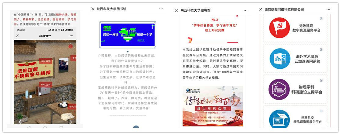 線上活動(dòng),豐富多彩。為豐富活動(dòng)形式,圖書館積極與數(shù)據(jù)庫商聯(lián)系,開展線上活動(dòng)。推出“銘記非凡歲月·弘揚(yáng)中國精神”的紅色主題展;“傳承紅色基因,培養(yǎng)時(shí)代新人”主題線上講座、黨史知識(shí)競賽和紅色家書征集活動(dòng);數(shù)據(jù)資源平臺(tái)試用,猜題贏大獎(jiǎng)活動(dòng);科學(xué)分解閱讀行為,將閱讀拆分為小目標(biāo)的閱讀習(xí)慣養(yǎng)成活動(dòng)等,為讀者提供了豐富的學(xué)習(xí)資源。