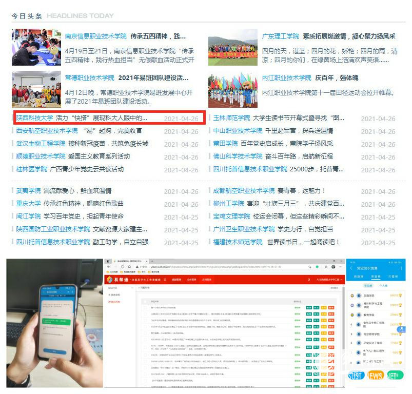 近期,我校易班發(fā)展中心結(jié)合工作實際創(chuàng)新形式、豐富載體,積極搭建網(wǎng)絡(luò)競答、互動分享等新媒體平臺,推出“黨史知識競賽”“文創(chuàng)產(chǎn)品設(shè)計大賽”“心向黨,在路上”“百人百講學(xué)習(xí)教育”“巧剪寄初心,青春獻祖國”等系列主題活動,制做百年紅色行、“西遷”紀念專欄、黨史精品優(yōu)課等多個學(xué)習(xí)輕應(yīng)用。截止目前,系列活動參與近2萬人次,學(xué)生用充滿活力的青春跳躍獻禮建黨百年,抒發(fā)青年學(xué)子愛黨愛國的深厚熱情。2021年4月,我校易班各類活動新聞報道連續(xù)4次登上“易班網(wǎng)—今日頭條”版塊。
