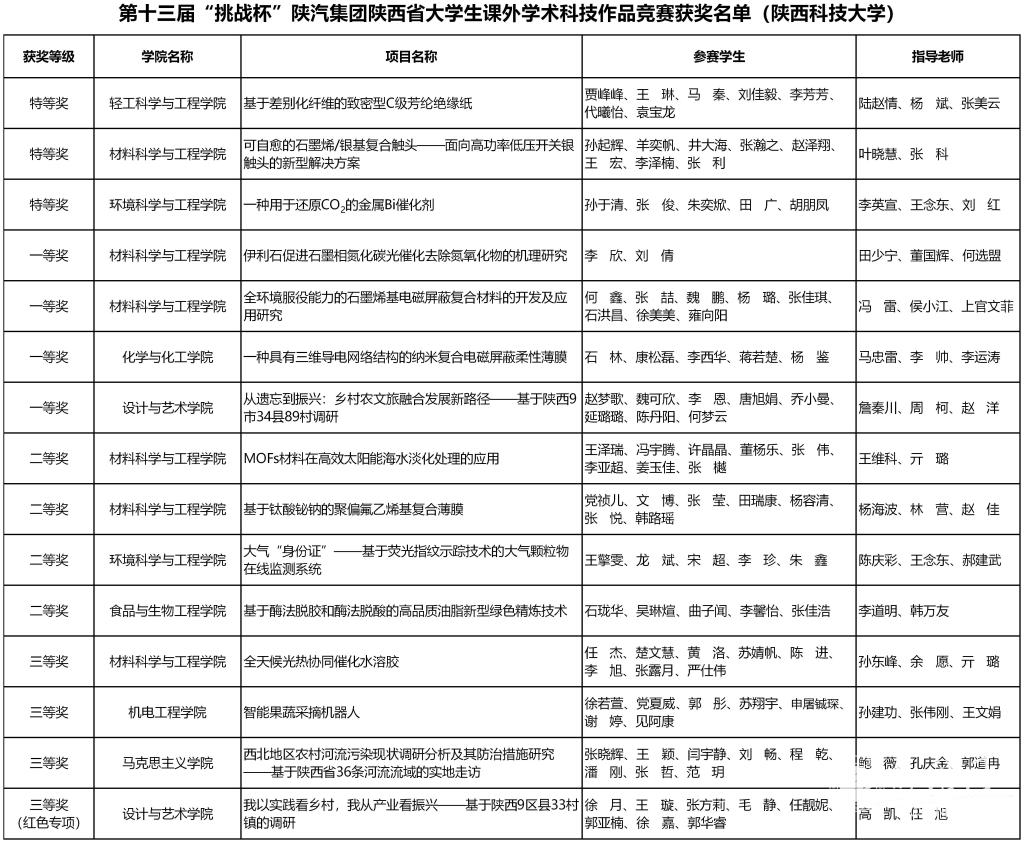 其中,輕工科學(xué)與工程學(xué)院《基于差別化纖維的致密型C級芳綸絕緣紙》、材料科學(xué)與工程學(xué)院《可自愈的石墨烯/銀基復(fù)合觸頭——面向高功率低壓開關(guān)銀觸頭的新型解決方案》、環(huán)境科學(xué)與工程學(xué)院《一種用于還原CO2的金屬Bi催化劑》3件作品榮獲特等獎;化學(xué)與化工學(xué)院《一種具有三維導(dǎo)電網(wǎng)絡(luò)結(jié)構(gòu)的納米復(fù)合電磁屏蔽柔性薄膜》、設(shè)計與藝術(shù)學(xué)院《從遺忘到振興:鄉(xiāng)村農(nóng)文旅融合發(fā)展新路徑——基于陜西9市34縣89村調(diào)研》等4件作品獲得一等獎;食品與生物工程學(xué)院《基于酶法脫膠和酶法脫酸的高品質(zhì)油脂新型綠色精煉技術(shù)》、材料科學(xué)與工程學(xué)院《伊利石促進石墨相氮化碳光催化去除氮氧化物的機理研究》等4件作品獲得二等獎;機電工程學(xué)院《智能果蔬采摘機器人》、馬克思主義學(xué)院《西北地區(qū)農(nóng)村河流污染現(xiàn)狀調(diào)研分析及其防治措施研究——基于陜西省36條河流流域的實地走訪》等4件作品獲得三等獎。