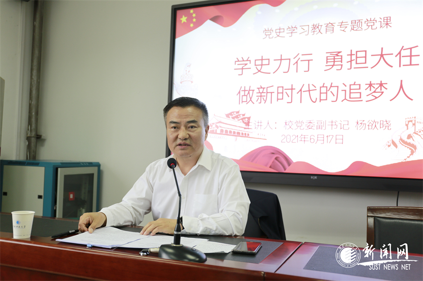 6月17日下午,校黨委副書記、校黨史學(xué)習(xí)教育領(lǐng)導(dǎo)小組副組長楊欲曉以“學(xué)史力行、勇?lián)笕危鲂聲r(shí)代的追夢人”為題,在圖書館206培訓(xùn)室為分管部門全體黨員講授了一堂精彩的黨史學(xué)習(xí)教育專題黨課。
