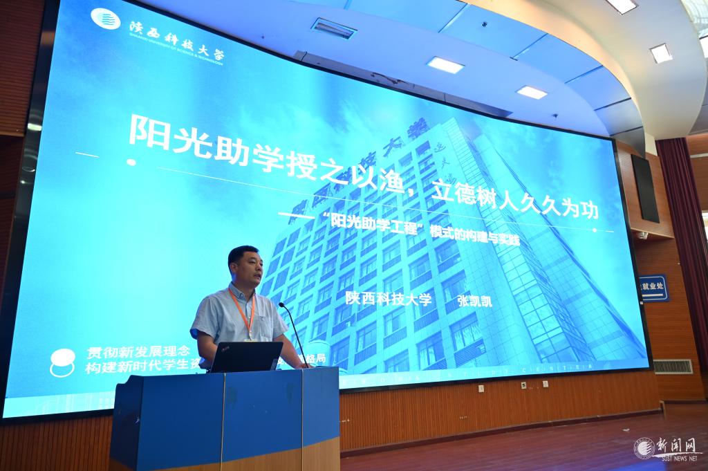張凱凱以《陽光助學(xué)授之以漁立德樹人久久為功——陜西科技大學(xué)陽光助學(xué)工程的構(gòu)建與實踐》為題,進行發(fā)言。他圍繞學(xué)?!瓣柟庵鷮W(xué)工程”資助育人體系的構(gòu)建與實踐探索,詳細介紹了我校將“人才培養(yǎng)模式改革”“創(chuàng)業(yè)實踐基地建設(shè)”“捐助扶持制度建設(shè)”“精神資助體系構(gòu)建”作為突破口,推出能力提升計劃,建設(shè)六大經(jīng)濟實體,設(shè)立三大助學(xué)基金,構(gòu)建一體化陽光精神資助體系的工作模式。