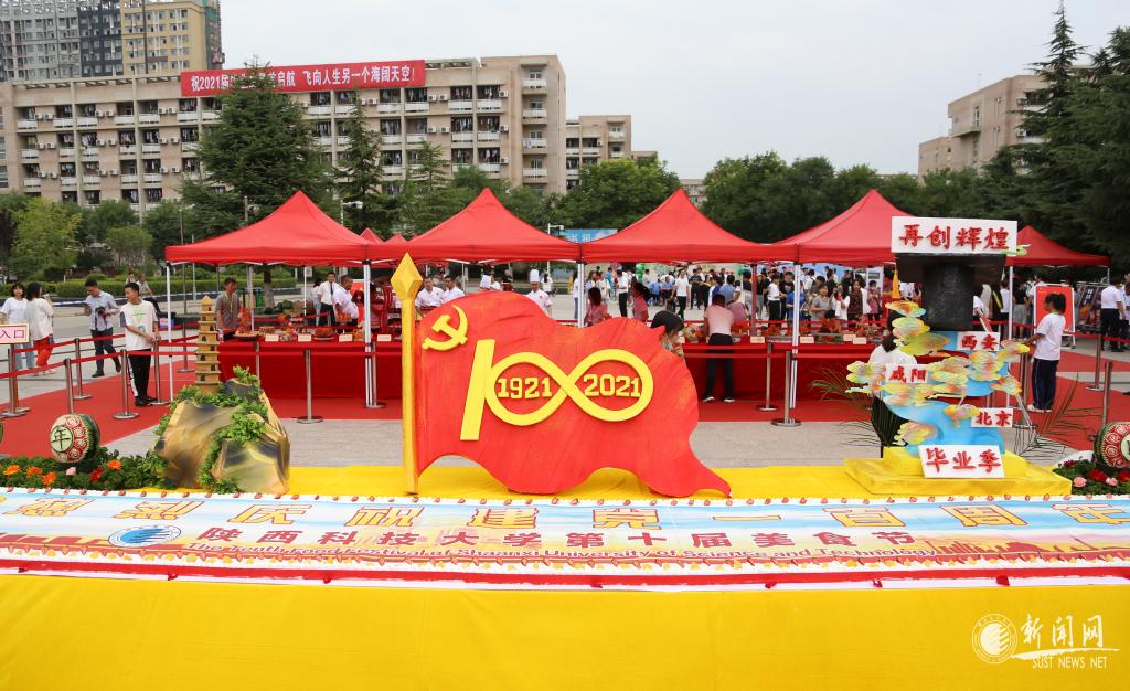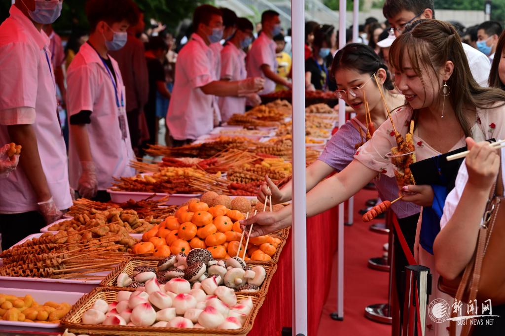 活動現(xiàn)場一片歡騰,師生們觀賞烹飪技藝、品嘗特色美食,感受陜科大特色飲食文化。進(jìn)入活動區(qū)域,首先映入眼簾的是現(xiàn)場制作的“熱烈慶祝建黨一百周年”蛋糕,莊嚴(yán)而喜慶,整個蛋糕長10米,可供6250名師生享用。在觀賞區(qū),孔雀開屏、金雞報曉、鳥語花香、金玉滿堂等雕刻作品栩栩如生,彰顯了中華美食文化的博大精深,展示了廚師們的精湛技藝。品嘗區(qū)的各種熱菜、西點、小吃、燒烤、水果、飲料,一應(yīng)美食琳瑯滿目,吸引得師生們早早地排起了長隊。在互動區(qū),免費抽獎臺前人頭攢動,獎品有玩偶、小風(fēng)扇、飲料、餐券等。活動現(xiàn)場,后勤工作人員和學(xué)生志愿者們有條不紊地分發(fā)餐具和食物、兌換小獎品、維持現(xiàn)場秩序,現(xiàn)場熱鬧而有序。學(xué)生代表獻(xiàn)唱了《我和我的祖國》《繡紅旗》等合唱和獨唱歌曲,將現(xiàn)場氣氛一次次推向高潮。