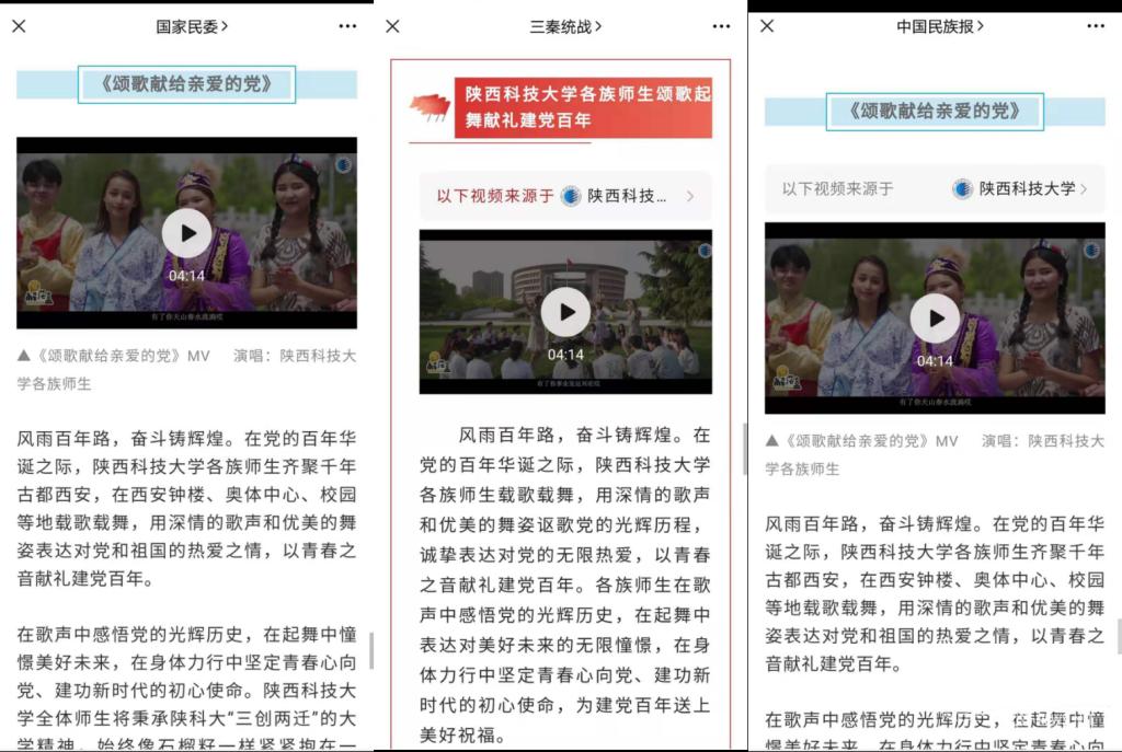 近日,由網(wǎng)絡(luò)思想政治工作中心聯(lián)合經(jīng)濟與管理學(xué)院黨委出品的《頌歌獻(xiàn)給親愛的黨》受到國家民委、三秦統(tǒng)戰(zhàn)、中國民族報等多家官方媒體的轉(zhuǎn)載報道。