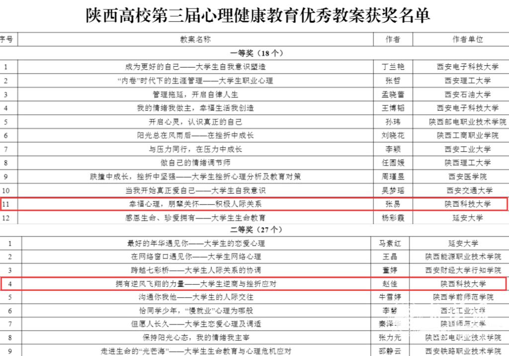 學(xué)工部心理中心教師張易的心理教案《幸福心理,朋輩關(guān)懷——積極人際關(guān)系》榮獲陜西高校第三屆心理健康教育優(yōu)秀教案一等獎(jiǎng),該作品引導(dǎo)學(xué)生運(yùn)用贊美、積極評(píng)論、共情技術(shù)營(yíng)造良好的人際關(guān)系。材料科學(xué)與工程學(xué)院輔導(dǎo)員趙佳的心理教案《擁有逆風(fēng)飛翔的力量——大學(xué)生逆商與挫折應(yīng)對(duì)》榮獲二等獎(jiǎng),關(guān)注大學(xué)生挫折應(yīng)對(duì)與逆商培養(yǎng),引導(dǎo)學(xué)生正視挫折。