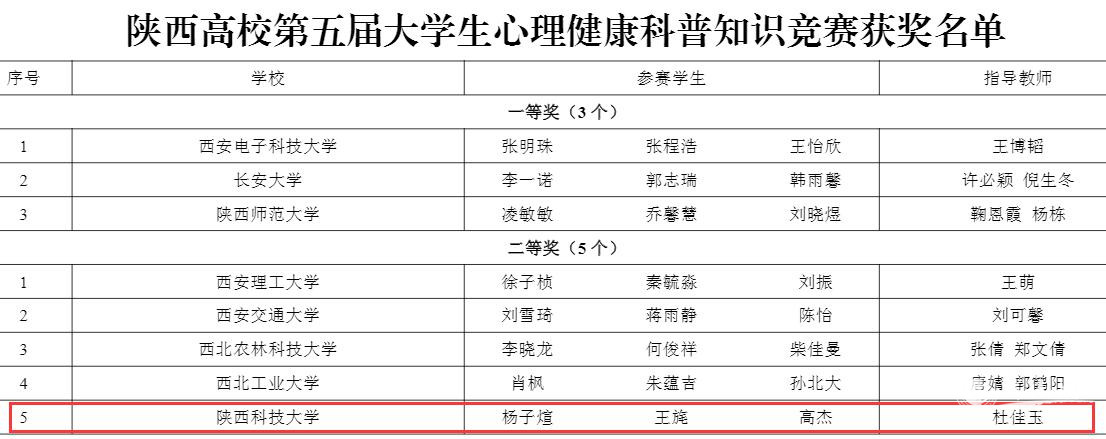 近日,陜西省委教育工委公布了陜西高校第六屆心理育人宣傳季活動(dòng)的評(píng)審結(jié)果,我校所有參報(bào)項(xiàng)目均獲獎(jiǎng),共斬獲7項(xiàng)獎(jiǎng)項(xiàng),分別為陜西高校第三屆心理健康教育優(yōu)秀教案一等獎(jiǎng)(1項(xiàng))、二等獎(jiǎng)(1項(xiàng)),第七屆心理健康教育優(yōu)秀咨詢案例二等獎(jiǎng)(1項(xiàng))、三等獎(jiǎng)(1項(xiàng)),第四屆校園心理情景劇一等獎(jiǎng)(1項(xiàng))、二等獎(jiǎng)(1項(xiàng)),陜西高校第五屆大學(xué)生心理健康科普知識(shí)競(jìng)賽二等獎(jiǎng)。