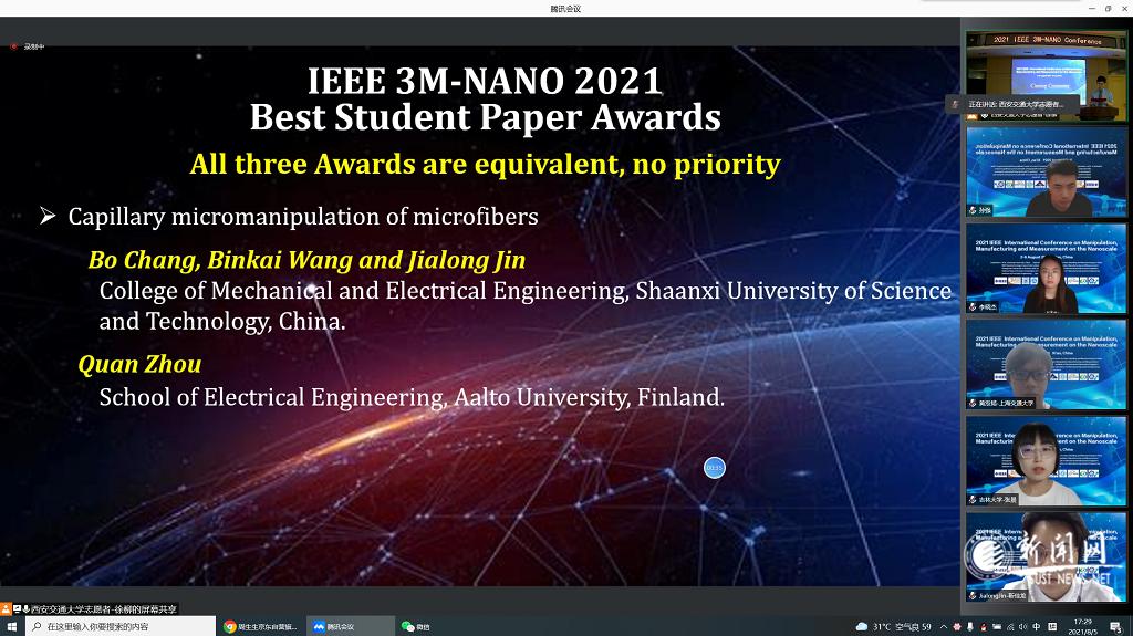 會(huì)議期間,我校師生和國(guó)內(nèi)外專家在線進(jìn)行了充分的交流與探討,來(lái)自世界各地的專家學(xué)者對(duì)我校在微納操作領(lǐng)域的工作給予了高度評(píng)價(jià)。此次獲獎(jiǎng)對(duì)提高我校在微納米操作領(lǐng)域國(guó)內(nèi)外影響力、激勵(lì)研究生參與國(guó)際學(xué)術(shù)交流起到了積極的推動(dòng)作用。