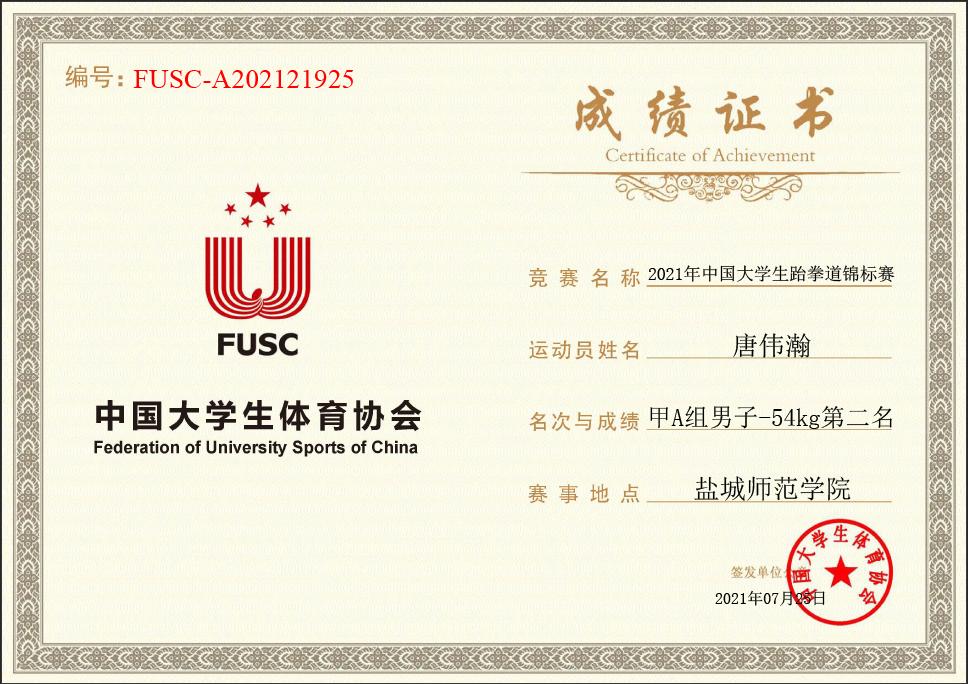 近日,我校跆拳道代表隊(duì)斬獲2021年中國(guó)大學(xué)生跆拳道錦標(biāo)賽高校甲A組男子54kg級(jí)第二名。