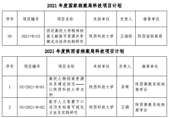 同時,我校檔案館吳碩、王娟獲批2021年度陜西省檔案局科技項目立項,全省共立項18項,我校檔案館獲批立項數(shù)量位居全省前列。