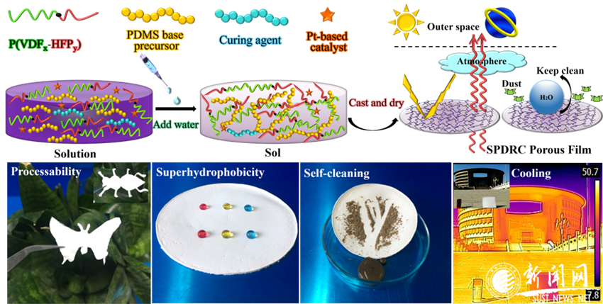 薛朝華教授團(tuán)隊(duì)針對輻射降溫材料在戶外使用中存在的上述問題,發(fā)明了一種超疏水自清潔輻射降溫薄膜及其制備方法,利用非溶劑誘導(dǎo)相分離法使聚偏氟乙烯-共-六氟丙烯/聚二甲基硅氧烷(PVDF-HFP/PDMS)復(fù)合聚合物形成具有微/納雙重粗糙結(jié)構(gòu)的三維多孔薄膜材料。利用PVDF-HFP和PDMS在中紅外區(qū)(8-13 μm)的高發(fā)射特性和膜材料內(nèi)部多孔結(jié)構(gòu)所提供的高反射率和高紅外發(fā)射率,結(jié)合P(VDF-HFP)和PDMS的低表面能性質(zhì)和薄膜材料表面的微納粗糙結(jié)構(gòu)賦予材料表面超疏水性能,使材料兼具輻射自降溫和自清潔功能。制備的材料放置室外一個(gè)月仍能保持優(yōu)異的輻射降溫性能,保障了降溫效果的持久性。該發(fā)明的研究實(shí)驗(yàn)由博士生柳冰瑩完成,于2019年8月21日申請了國家發(fā)明專利并于2021年6月15日獲批授權(quán)(ZL201910774588.9),2019年11月8日申請國際發(fā)明專利并于2021年2月23日獲批授權(quán)(US 10927244B1)。
