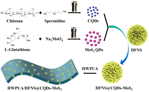 HWPUA/DFNS@CQDs-MoS2抗菌涂層材料制備示意圖