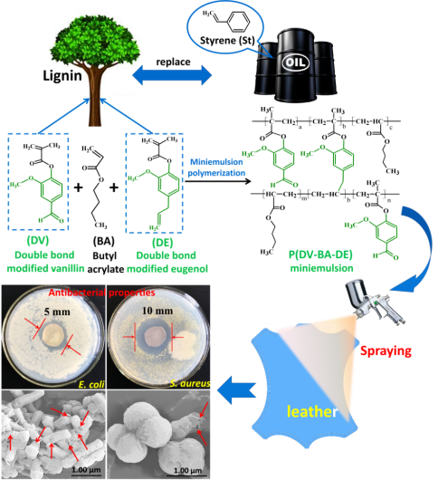 水性聚合物涂層方面,以改性生物質(zhì)芳香族單體雙鍵化香草醛(DV)和雙鍵化丁香酚(DE),分別作為石油基原料苯乙烯(St)替代物和生物質(zhì)基交聯(lián)劑,與丙烯酸丁酯(BA)共聚,制得P(DV-BA-DE)細乳液,將其作為石油基苯丙乳液替代物,應(yīng)用于皮革涂飾,涂飾后皮革表現(xiàn)出明顯的抗菌性能。研究成果以“A sustainable waterborne vanillin-eugenol-acrylate miniemulsion with suitable antibacterial properties as a substitute for the styrene-acrylate emulsion”為題,發(fā)表在化學(xué)領(lǐng)域國際知名期刊《Green Chemistry》上,并被選為封面文章,我校為論文第一通訊單位,第一作者為我校張雷博士生,通訊作者為我校馬建中教授,共同通訊作者為我校張躍宏副教授和英國蘇格蘭農(nóng)學(xué)院Vijay Kumar Thakur教授。