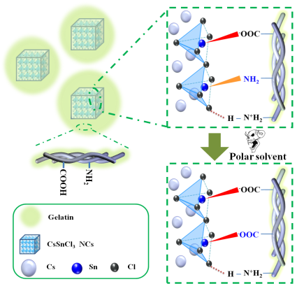 高穩(wěn)定性明膠-錫鹵鈣鈦礦量子點的作用機理示意圖
