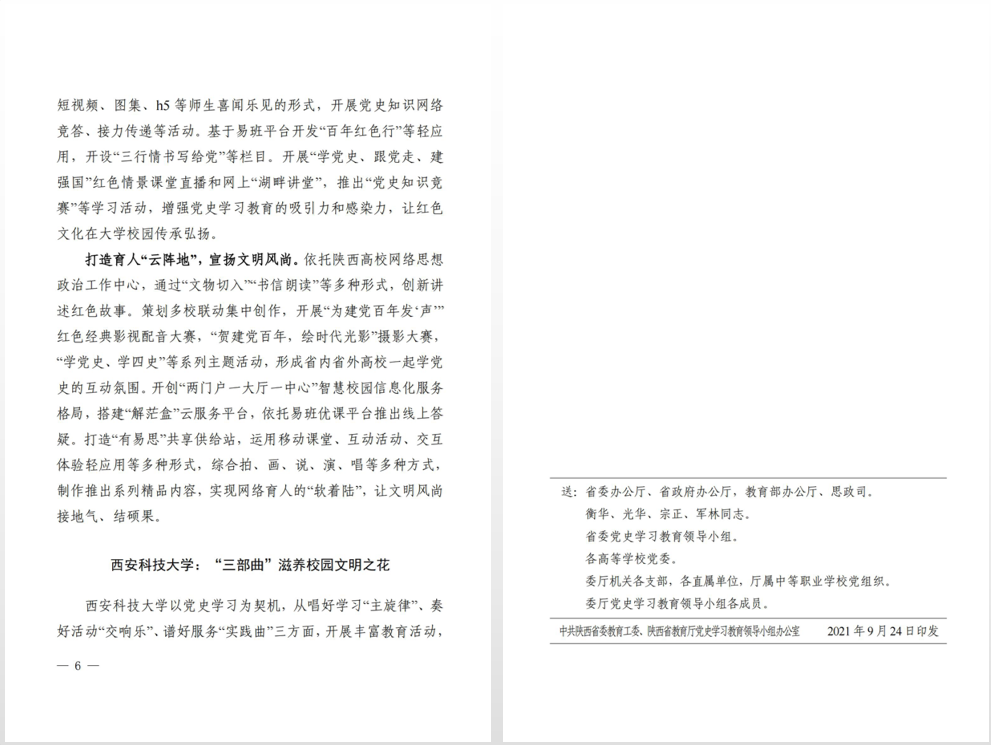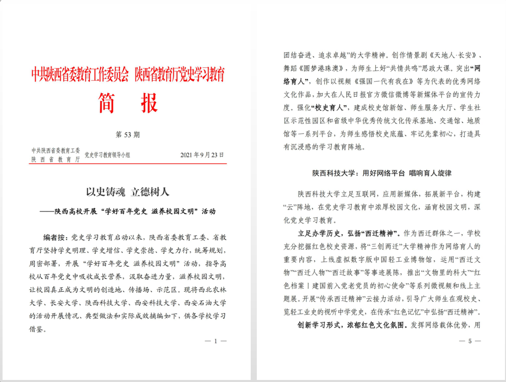 9月23日,《中共陜西省委教育工作委員會、陜西省教育廳黨史學(xué)習(xí)教育簡報》(第53期)以《陜西科技大學(xué):用好網(wǎng)絡(luò)平臺唱響育人旋律》為題報道了我校利用網(wǎng)絡(luò)平臺開展黨史學(xué)習(xí)教育的相關(guān)做法和成效。這是省委教育工委黨史學(xué)習(xí)教育簡報繼第7期、第50期專題報道我校黨史學(xué)習(xí)教育特色活動“榜樣,你好!”之后對我校的第3次報道。