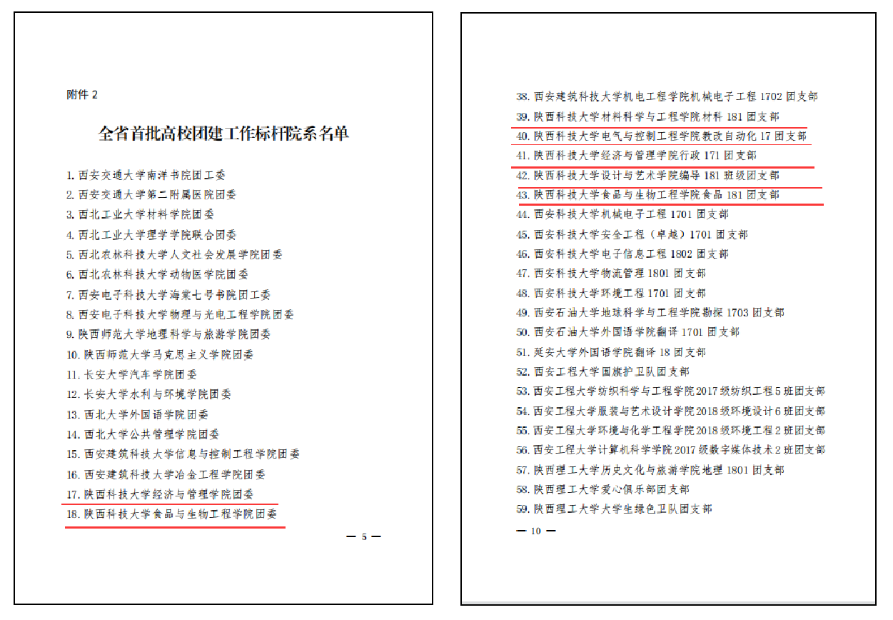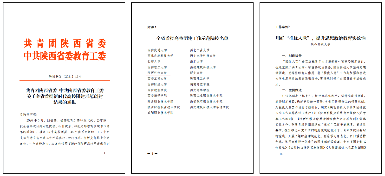 近日,共青團(tuán)陜西省委、中共陜西省委教育工委公布《關(guān)于全省首批新時代高校團(tuán)建示范創(chuàng)建結(jié)果的通報》,按照明確的驗收工作辦法,經(jīng)創(chuàng)建單位對標(biāo)自查總結(jié)、現(xiàn)場答辯、實地驗收,反饋整改等環(huán)節(jié),我校完成示范建設(shè)任務(wù),通過驗收結(jié)果如下:陜西科技大學(xué)通過全省首批高校團(tuán)建工作示范院校驗收;食品與生物工程學(xué)院團(tuán)委、經(jīng)濟(jì)與管理學(xué)院團(tuán)委通過全省首批高校團(tuán)建工作標(biāo)桿院系驗收;材料科學(xué)與工程學(xué)院材科181團(tuán)支部,電氣與控制工程學(xué)院教改自動化17團(tuán)支部,經(jīng)濟(jì)與管理學(xué)院行政171團(tuán)支部,設(shè)計與藝術(shù)學(xué)院編導(dǎo)181班級團(tuán)支部,食品與生物工程學(xué)院食品181團(tuán)支部通過全省首批高校團(tuán)建工作樣板團(tuán)支部驗收;我校工作特色案例《用好“推優(yōu)入黨”,提升思想政治教育實效性》作為全省首批高校團(tuán)建創(chuàng)建工作案例第一篇進(jìn)行公布。