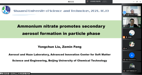 10月19日,應我校環(huán)境科學與工程學院邀請,北京化工大學軟物質科學與工程高精尖創(chuàng)新中心劉永春教授做客我校“前沿科學報告”線上會議,本次報告會由科技處主辦,環(huán)境學院承辦,環(huán)境學院130余名師生以及全國大氣領域知名專家學者參加會議。會議由環(huán)境學院陳慶彩教授主持。