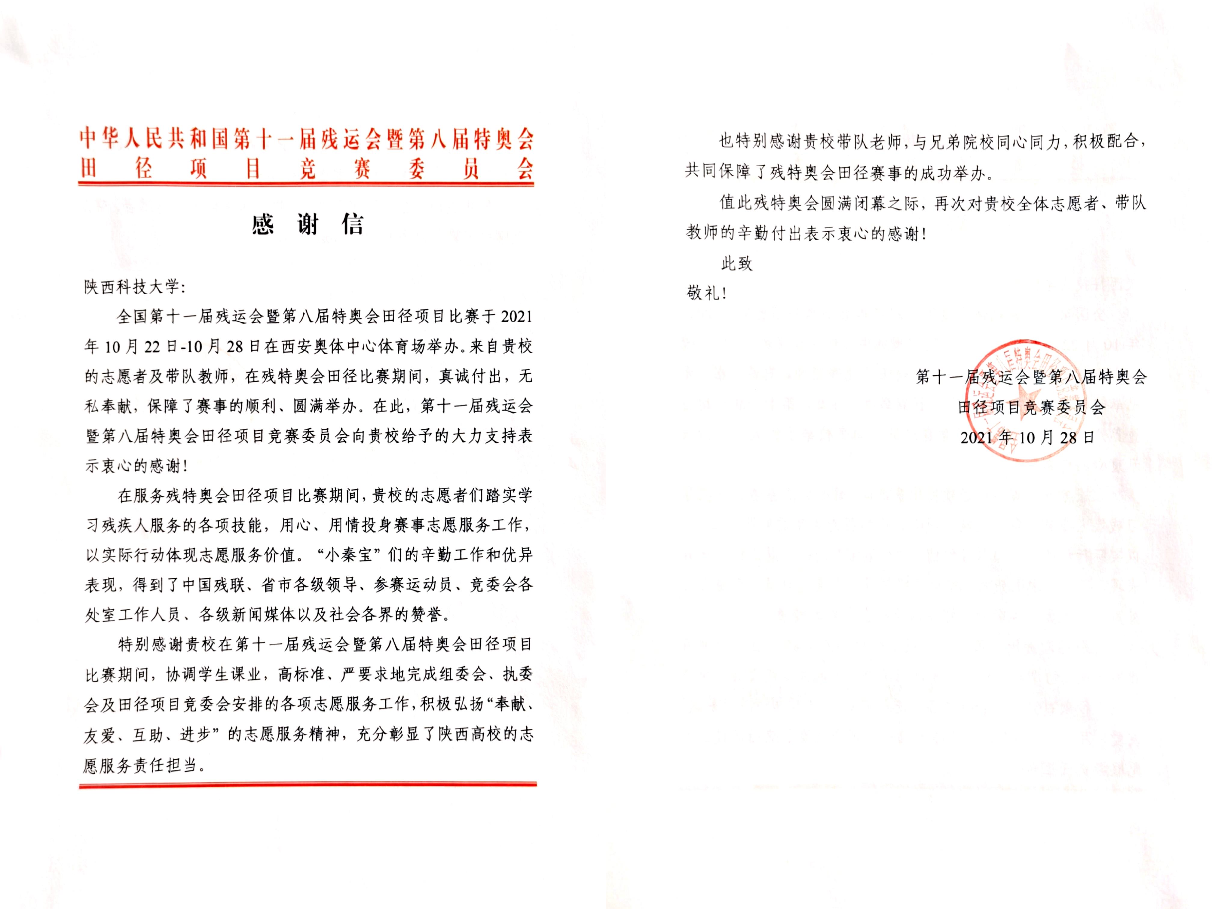 本次殘?zhí)貖W會志愿服務(wù)工作,陜西科技大學(xué)218名志愿者和5位帶隊(duì)教師積極投身志愿服務(wù)工作,全力以赴、奮勇向前,時刻秉承“三創(chuàng)兩遷”的大學(xué)精神,將“至誠至博”校訓(xùn)融入志愿服務(wù)工作中,為殘?zhí)貖W會提供了有溫度、高質(zhì)量、專業(yè)化的服務(wù)。他們用心、用情、用行動詮釋著“奉獻(xiàn)、友愛、互助、進(jìn)步”的志愿服務(wù)精神。星星點(diǎn)點(diǎn)的服務(wù)匯聚成海,鑄就了此次殘?zhí)貖W會田徑賽事的圓滿舉辦?!包c(diǎn)亮夢想,為愛起航”,科大小秦寶不負(fù)眾望,榮耀而歸。