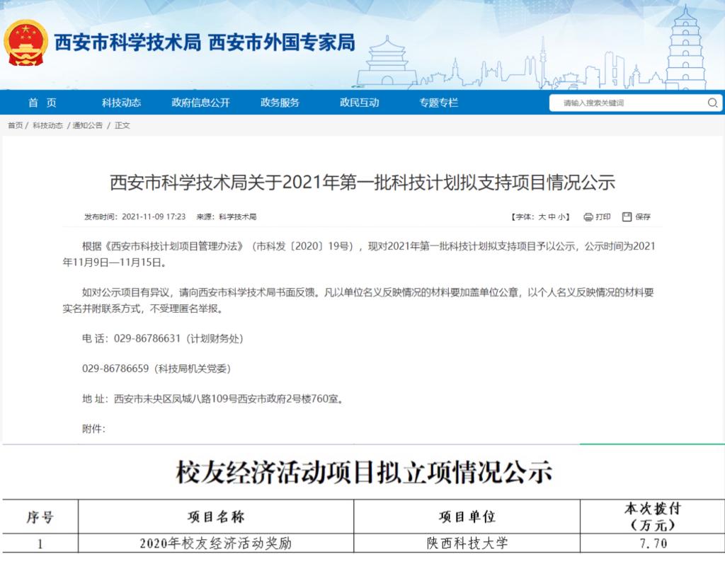 11月9日,西安市科學(xué)技術(shù)局根據(jù)《西安市科技計(jì)劃項(xiàng)目管理辦法》公布“2021年第一批科技計(jì)劃擬支持項(xiàng)目”,我校校友總會(huì)辦公室申報(bào)的“校友經(jīng)濟(jì)活動(dòng)項(xiàng)目”成功獲批項(xiàng)目經(jīng)費(fèi)7.7萬(wàn),是2021年度陜西唯一獲批該項(xiàng)目的高校。