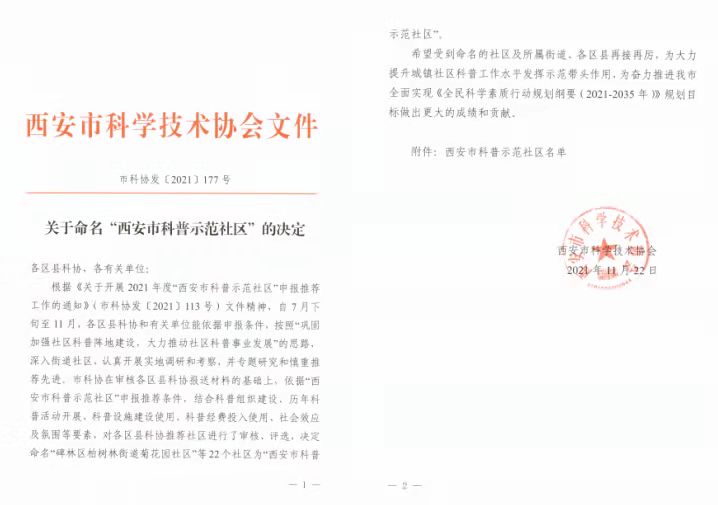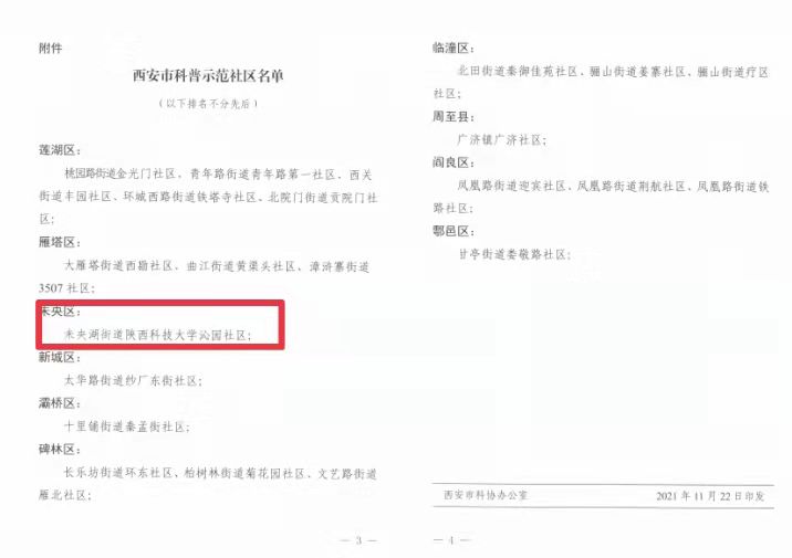 11月22日,西安市科學(xué)技術(shù)協(xié)會(huì)發(fā)布《關(guān)于命名“西安市科普示范社區(qū)”的決定》(市科協(xié)發(fā)〔2021〕177號(hào))文件,將西安市共22個(gè)社區(qū)命名為“西安市科普示范社區(qū)”。陜西科技大學(xué)沁園社區(qū)通過層層審核、評(píng)選,成為未央?yún)^(qū)唯一一個(gè)獲此命名的社區(qū)。